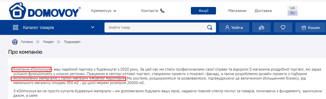 У мережу з цією назвою входить і магазин «Жовтий аероплан», що на вулиці Небесної Сотні, 53. За цією адресою (стара назва Пролетарська, 53) зареєстроване однойменне ПП «Жовтий аероплан», одним з кінцевих бенефіціарів якого є Кравченко Дмитро Васильович — заступник міського голови Кременчука з будівництва.