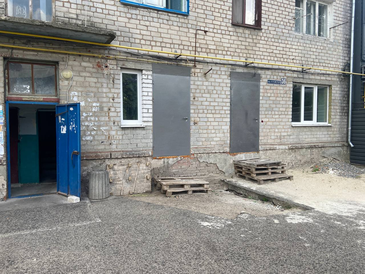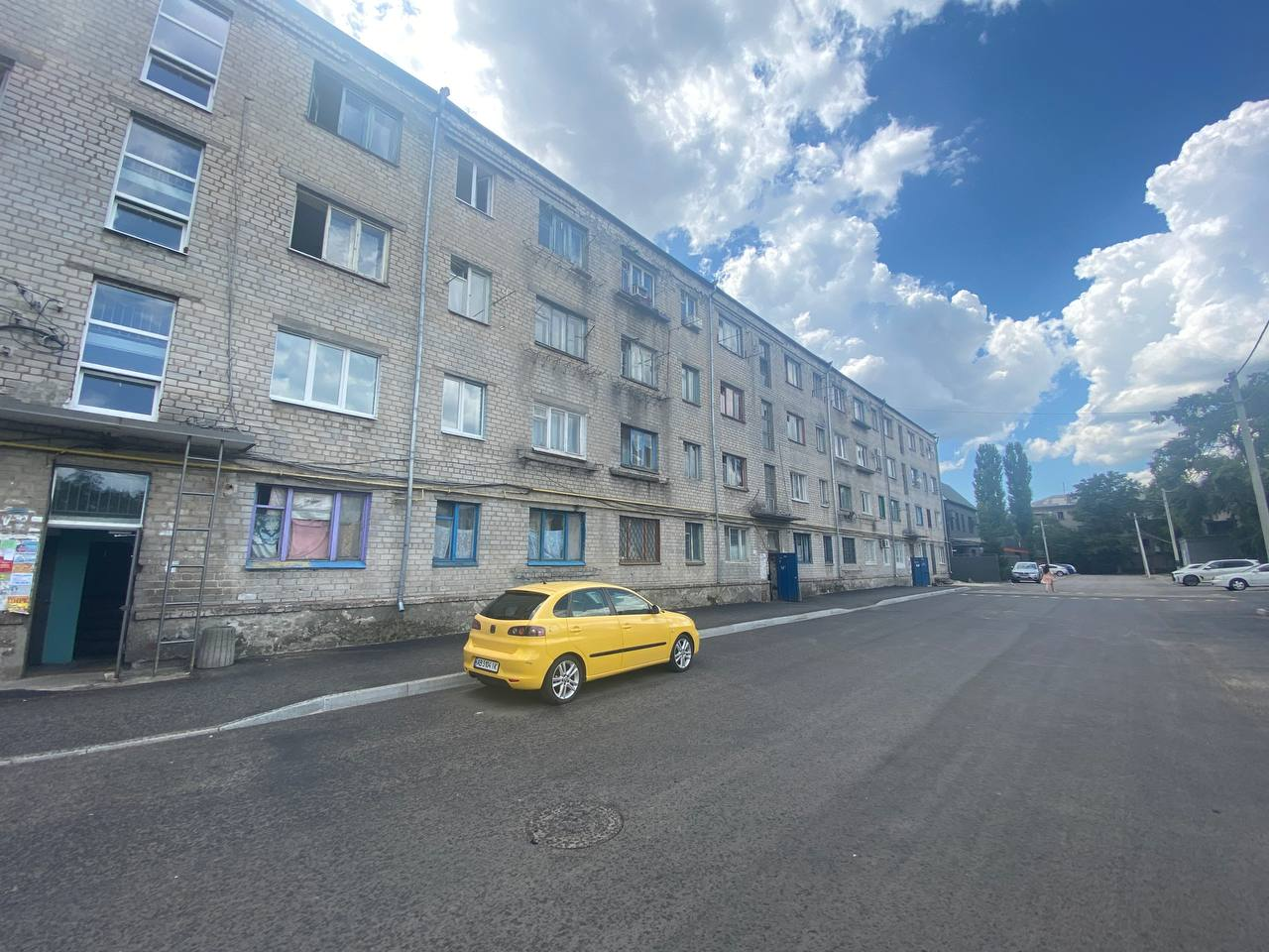 Ми поїхали подивитися на гуртожиток. Це — під'їзд, який віддали в оренду (перший поверх, третій під'їзд). Бачимо красиві поміняні вікна.