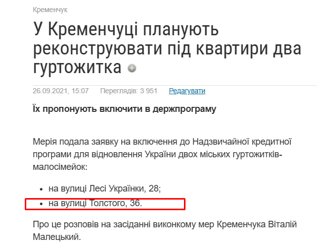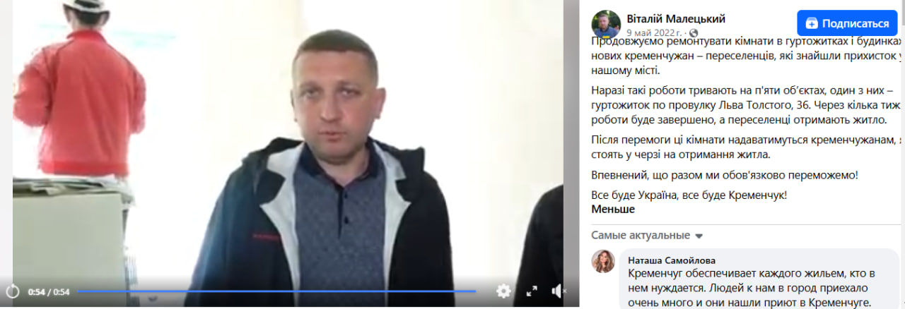 У травні 2022 року міський голова пан Малецький розміщує пост у соцмережах щодо гуртожитку по пров. Квітки Цісик 36 (Л. Толстого), де велись роботи з ремонту кімнат для переселенців. У проникливій промові «про все буде Кременчук» мер обіцяє, що після війни ці кімнати надаватимуться кременчужанам, які стоять у черзі на отримання житла. Пост засипали лайками та захопленими коментами, схожими на ботів.