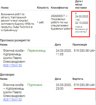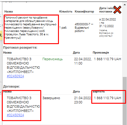 - Квітень 2022 року — 1,8 млн грн, виконання ремонтних робіт (ціну під час робіт зменшили).
