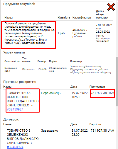 - Червень 2022 року — 700 тис. грн на ремонт та придбання матеріалів для облаштування місць тимчасового перебування внутрішньо переміщених осіб (ціну під час робіт зменшили).