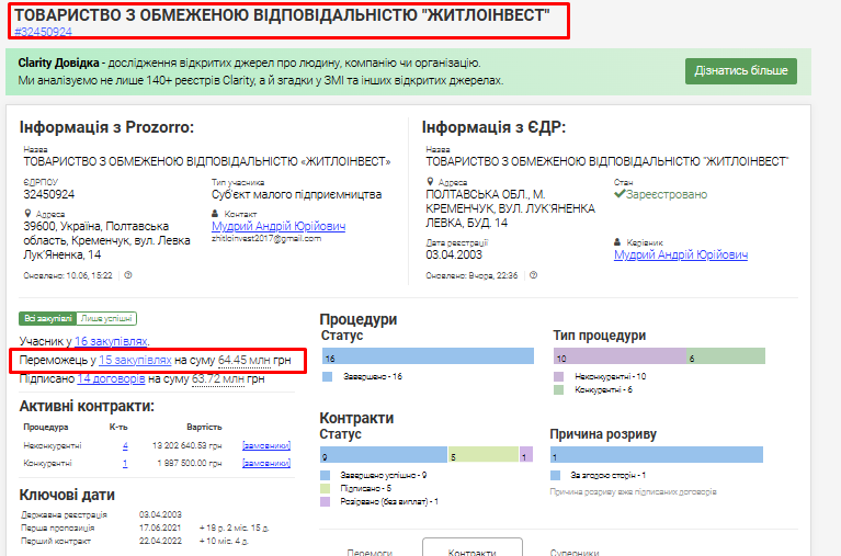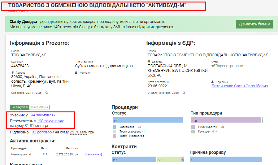 ТОВ «АКТИВБУД-М» — дуже успішна молода компанія, «дитя війни», бо народилась у 2022 році. І за час війни виграла тендерів від міської влади на 30 млн грн. Перемогла у 190 закупівлях.