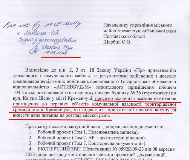 У жовтні 2023 мерія надала право зробити «невід'ємні поліпшення». У травні 2024-го орендар практично подає заявку на приватизацію приміщення.