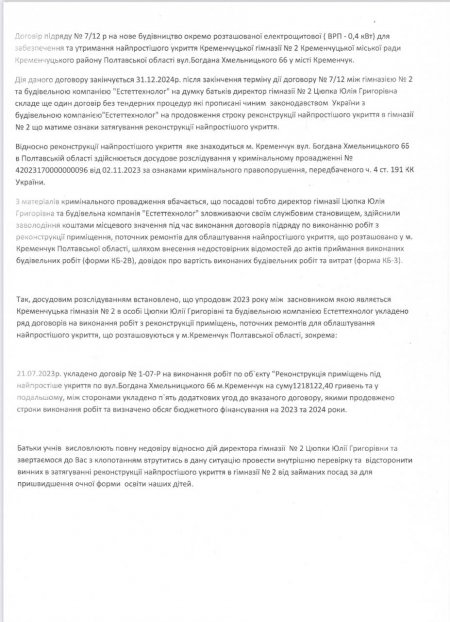 З матеріалів кримінального провадження вбачається, що посадові особи гімназії № 2, департаменту освіти Кременчуцької міськради та ТОВ «Будівельна компанія «Естеттехнолог» змовилися та, зловживаючи службовим становищем, заволоділи бюджетними коштами на облаштуванні найпростішого укриття у гімназії, шляхом внесення недостовірних відомостей до актів приймання виконаних будівельних робіт, довідок про вартість виконаних будівельних робіт та витрат.