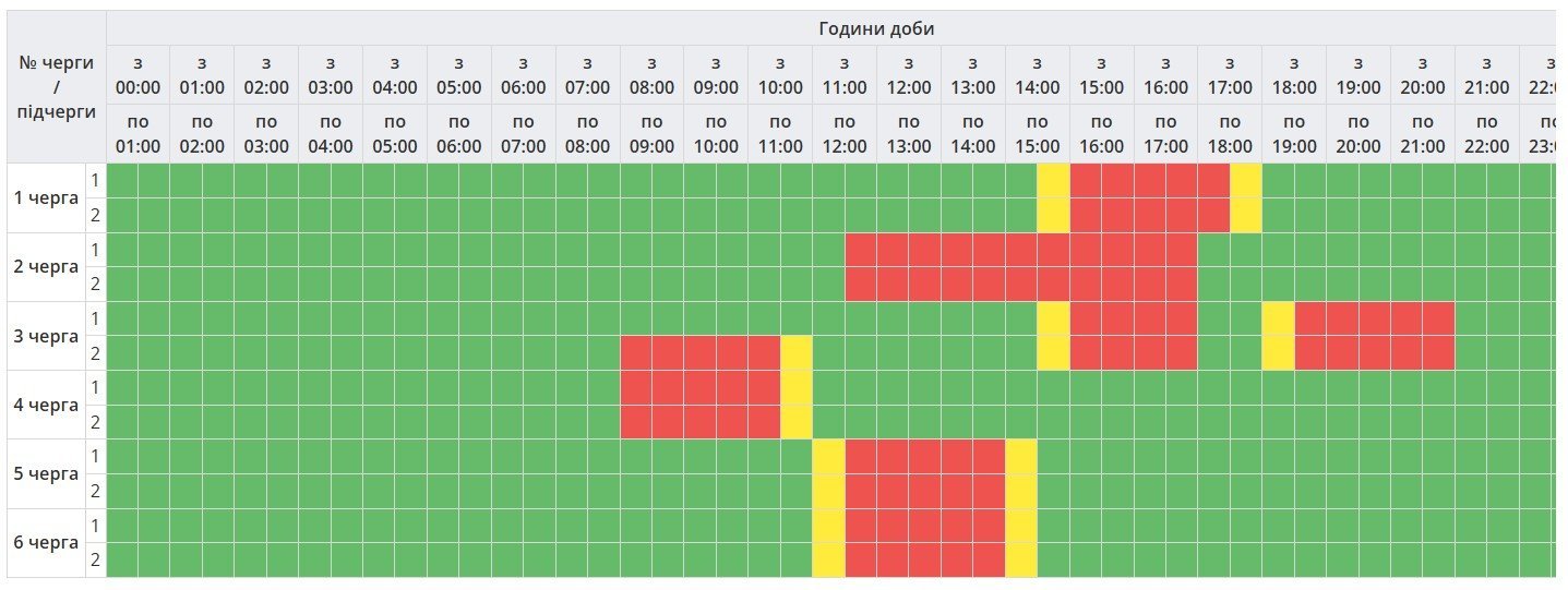 Тривалість відключень дещо збільшили: тепер із 11.30 до 17.00 знеструмлюватимуть по три черги споживачів.