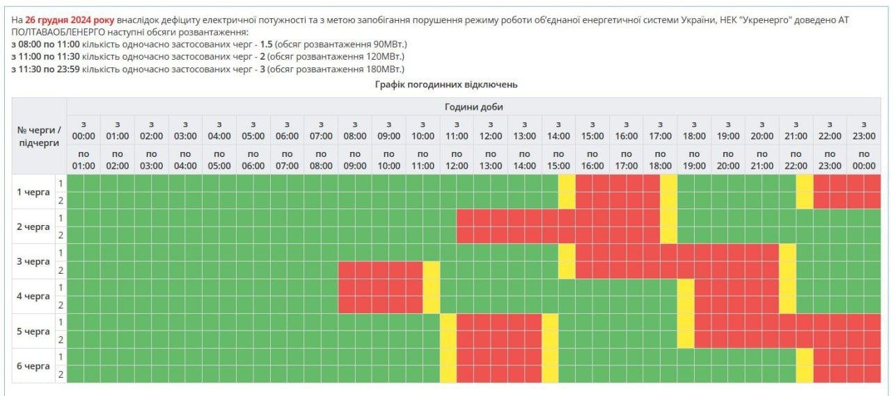 Нагадаємо, графіки погодинного відключення електроенергії на Полтавщині та по всій Україні запровадили внаслідок масованої ракетної атаки по енергетиці учора, 25 грудня.