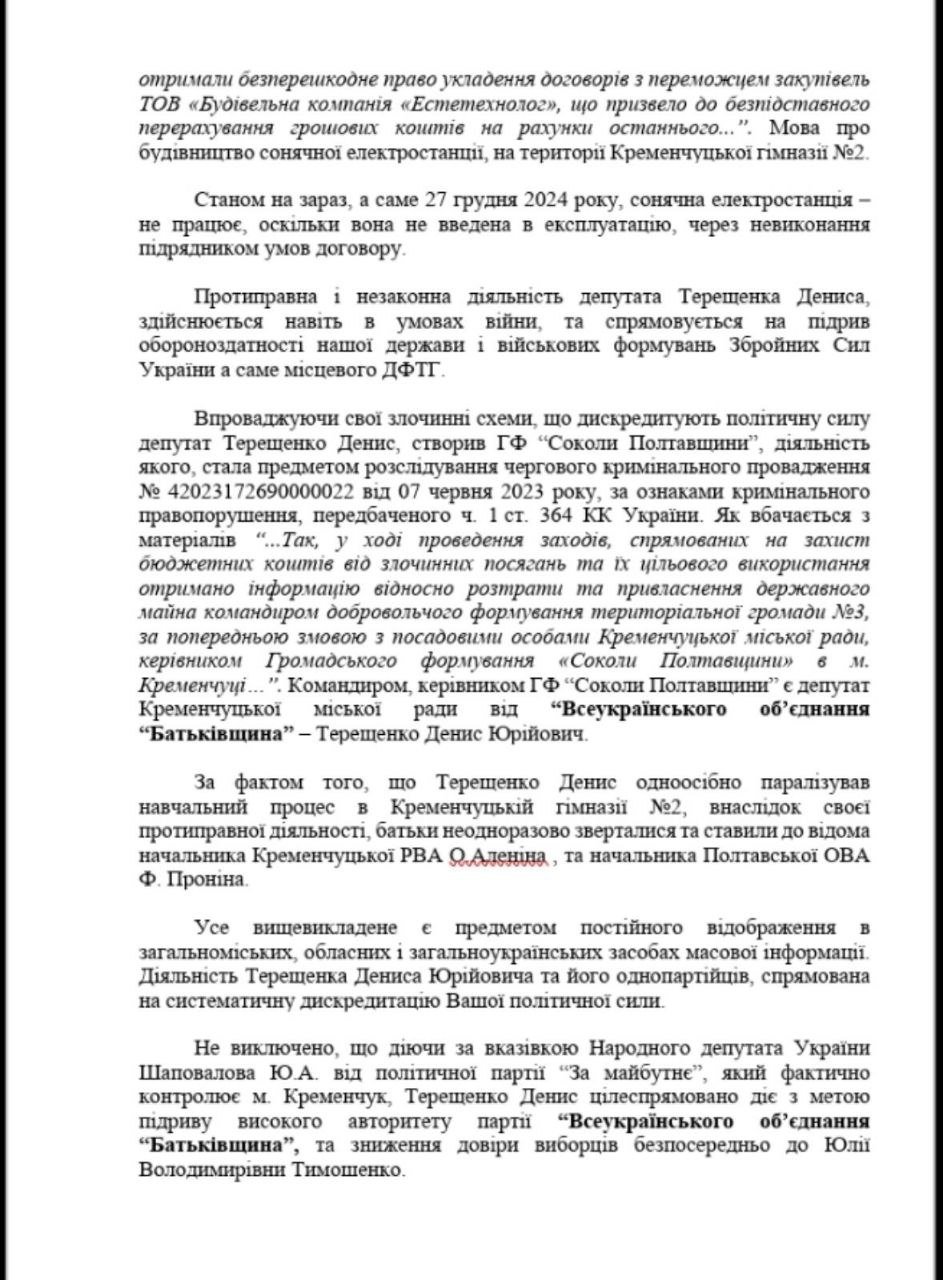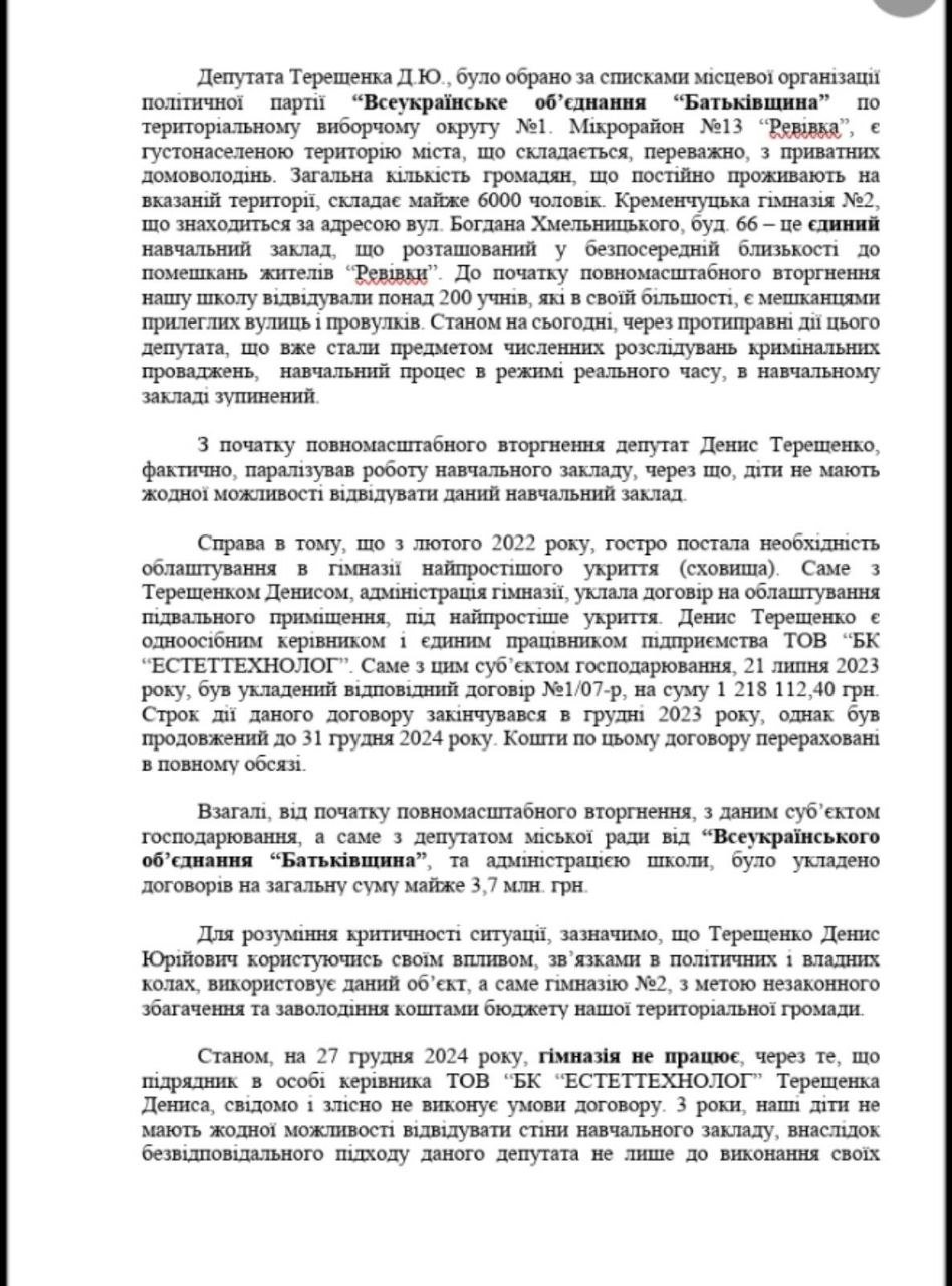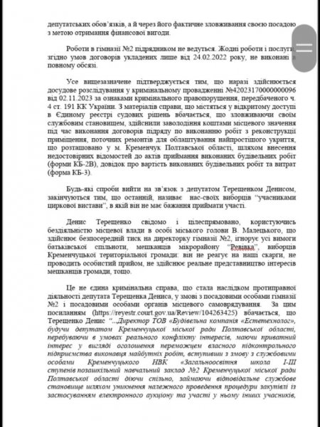 У своєму зверненні кременчуківці посилаються і на матеріали досудових розслідувань, зокрема щодо заволодіння бюджетними коштами під час реконструкції укриття, встановлення сонячної електростанції на території гімназії № 2. Також пан Терещенко є очільником громадського формування «Соколи Полтавщини» та фігурантом іще одного кримінального провадження щодо привласнення державного майна.