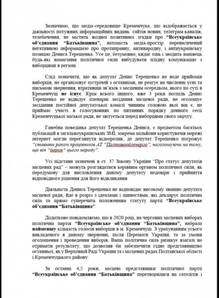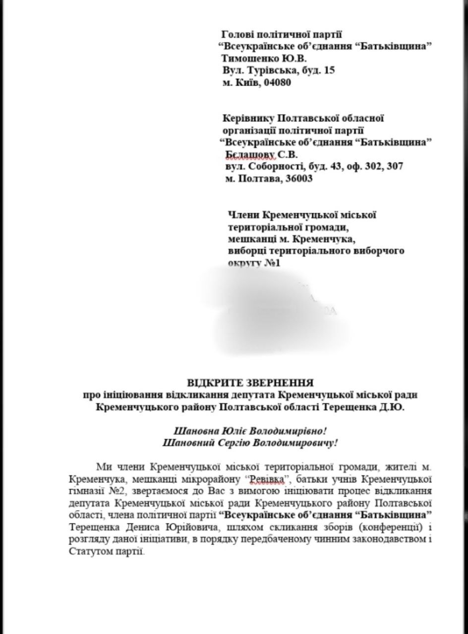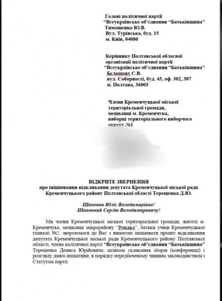 Жителі мікрорайону Ревівка у Кременчуці ініціювали звернення до лідерки партії «Батьківщина» Юлії Тимошенко та до керівника обласного осередку партії Сергія Бєлашова з проханням відкликати із членів партії депутата Кременчуцької міськради від територіального виборчого округу № 1 Дениса Терещенка. Відповідне звернення для оприлюднення кременчуківці надали і журналістам «Кременчуцького Телеграфа».