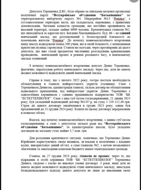 Тож на основі вищезазначеного мешканці Ревівки, зокрема й батьки учнів Кременчуцької гімназії № 2 просять розглянути їхнє звернення та посприяти виключенню Дениса Терещенка зі складу партії «Батьківщина».