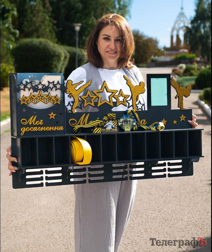 Колишня мешканка Донецька кілька років тому разом із чоловіком та донькою переїхали у Кременчук. Тут відкрили творчу майстерню «Еко-стиль». Це невелике виробництво сувенірної патріотичної, подарункової продукції для школярів та медальниць для спортсменів.