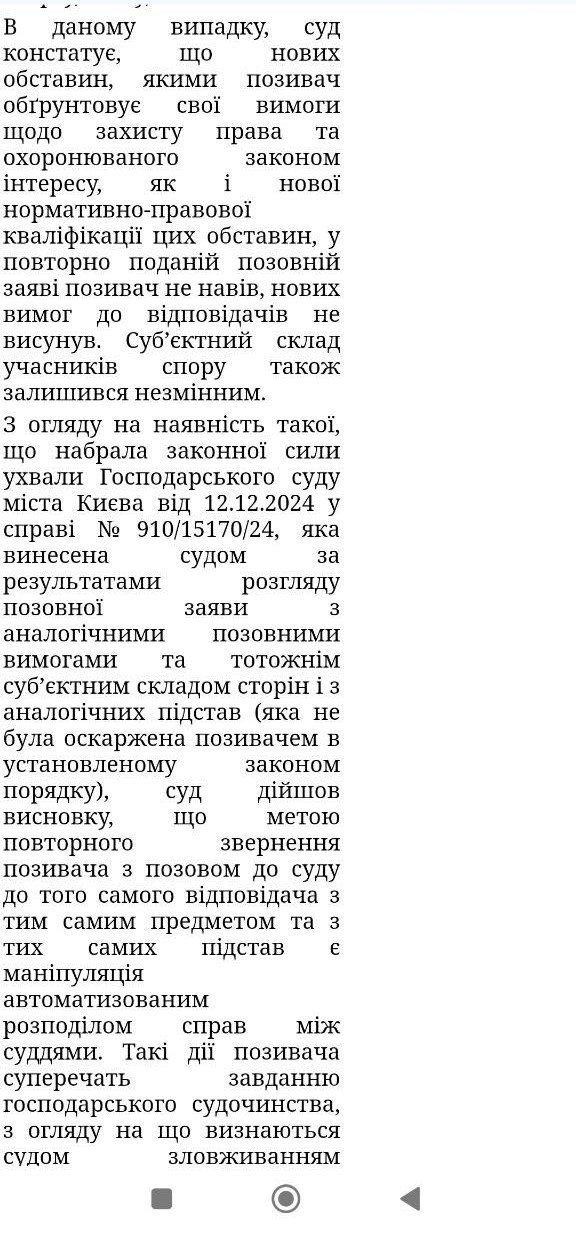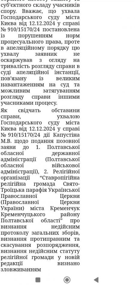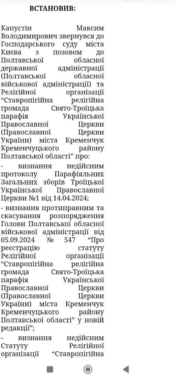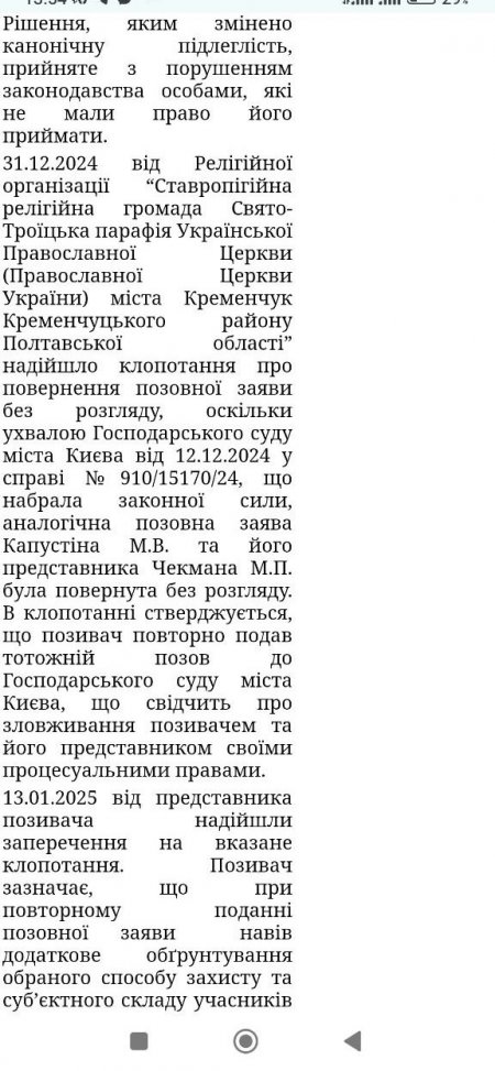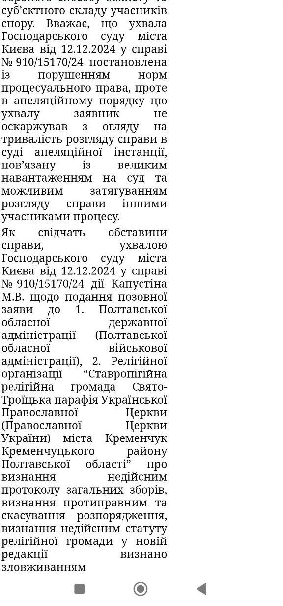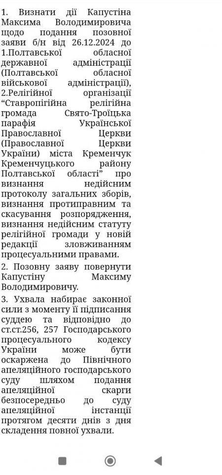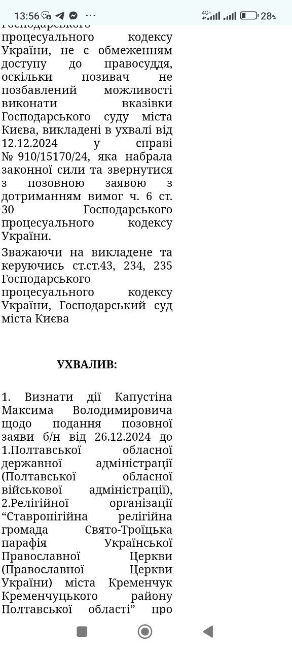 У новому рішенні Господарського суду міста Києва від 17 січня дії позивача (Капустіна Максима Володимировича) щодо подання позовної заяви 26 грудня 2024 року з тими ж вимогами до Полтавської обласної державної адміністрації та релігійної організації «Ставропігійна релігійна громада Свято-Троїцька парафія Православної Церкви України» у Кременчуці знову визнано зловживанням процесуальними правами.