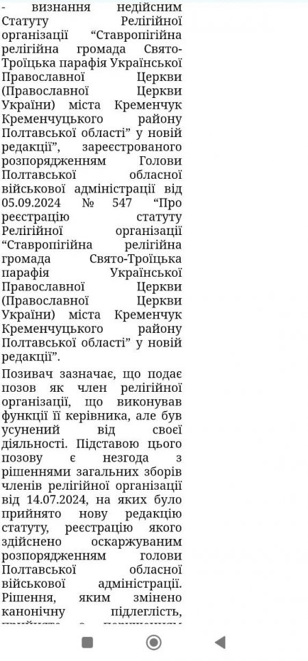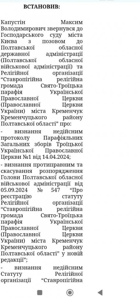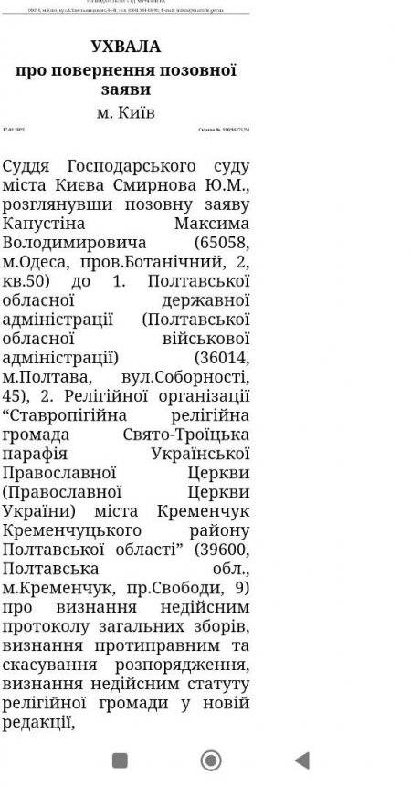 17 січня 2025 року Господарський суд міста Києва ухвалив рішення про повернення позовної заяви Владики Миколая [в миру — Максим Капустін — ред.] щодо спору з Полтавською обласною державною адміністрацією (ОДА) та релігійною організацією «Ставропігійна релігійна громада Свято-Троїцька парафія Православної Церкви України» у Кременчуці. Про це стало відомо з ухвали суду (справа № 910/16271/24).