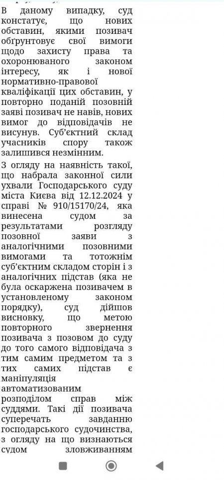 У своєму рішенні суд згадав про ухвалу Господарського суду міста Києва від 12 грудня 2024 року у справі № 910/15170/24, в якій той же самий позивач (Капустіна М.В.) вимагав того ж самого у тих же самих відповідачів. Тоді суд встановив, що позивач безпідставно включив Полтавську ОДА як відповідача для зміни підсудності справи до Господарського суду міста Києва, хоча спір стосувався внутрішніх питань релігійної організації.