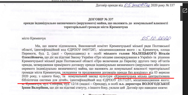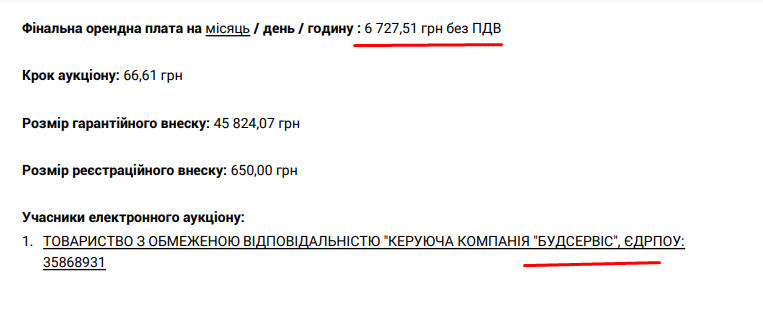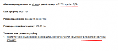 У лютому 2022 року компанія на аукціоні виграла право оренди цих приміщень у центрі. Вартість оренди — 6,7 тис. грн на місяць, площа — 369 квадратів. Компанія «Будсервіс» була єдиним учасником конкурсу. Договір підписаний строком на 5 років.