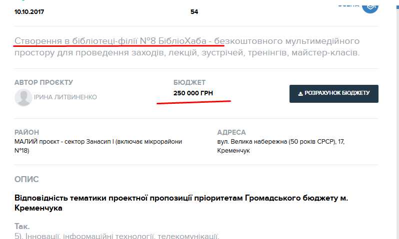 За кілька років до чергової оптимізації жителі району пропонували перетворити бібліотеку на сучасний хаб для зустрічей — закупити нові меблі, лампи, мультимедійне обладнання, підключити Wi-Fi зони. Проєкт подали на громадський бюджет у 2017-му, прохали 250 тис. Проєкт не виграв.