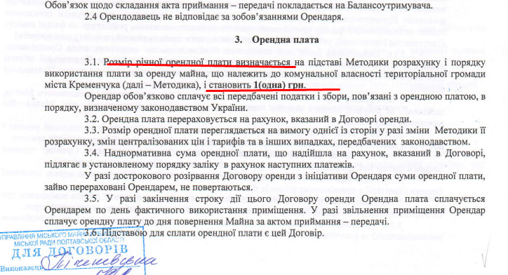 Скільки ви сплачуєте за послуги управляючої компанії? Підкажемо: в середньому, 6-7 грн за квадратний метр за послуги з обслуговування будинку та утримання прибудинкової території. Тобто, з однокімнатної квартири — приблизно 250 грн в місяць за послуги. Тим часом компанія, що надає ці послуги, за оренду комунального приміщення сплачує кременчуцькій громаді приблизно 8 грн за кв. м. Це якби ви орендували у мерії приміщення приблизно за 300 грн на місяць. Минулого року керуюча компанія отримала 1 мільйон чистого прибутку. Власник — колишній заступник міністра ЖКГ та ексзаступник мера Києва «Льоні-космоса».