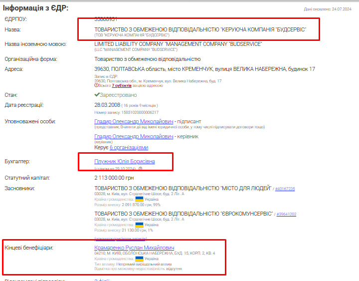 За даними сервісу Youcontrol, кінцевим власником ТОВ «КЕРУЮЧА КОМПАНІЯ «БУДСЕРВІС» є Крамаренко Руслан Михайлович, який у 2007-2010 роках був заступником міністра ЖКГ, а надалі — заступником мера Києва «Льоні-космоса».