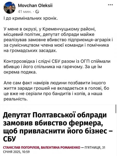 Контррозвідка та слідчі Служби безпеки України викрили депутата Полтавської обласної ради на організації замовного вбивства. За даними слідства, він планував ліквідувати власника місцевої агрокомпанії, щоб заволодіти його бізнесом. Про це повідомила пресслужба СБУ.