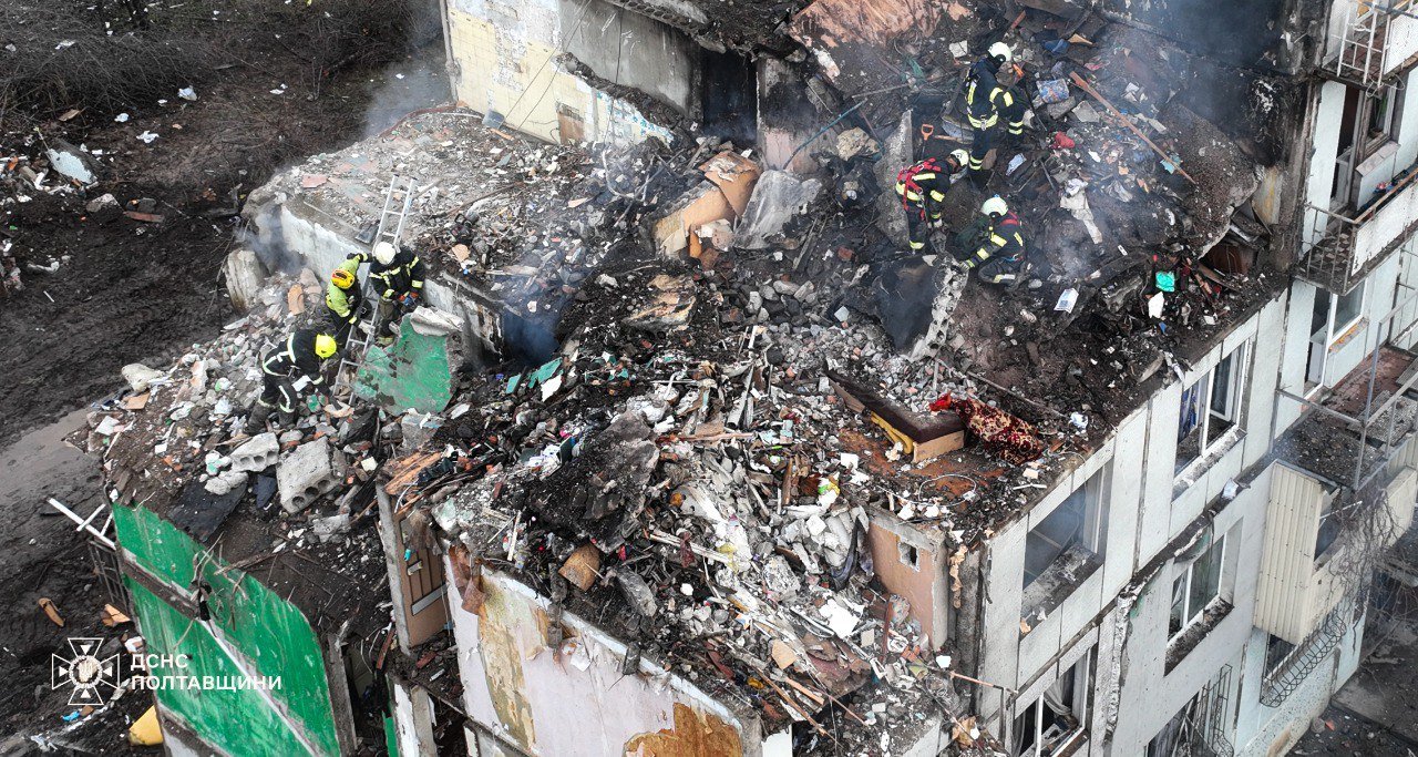 У Полтаві завершені аварійно-рятувальні роботи на місці зруйнованої п’ятиповерхівки внаслідок ракетного удару. Кількість загиблих становить 14 осіб. Про це повідомили у Державній службі України з надзвичайних ситуацій.
