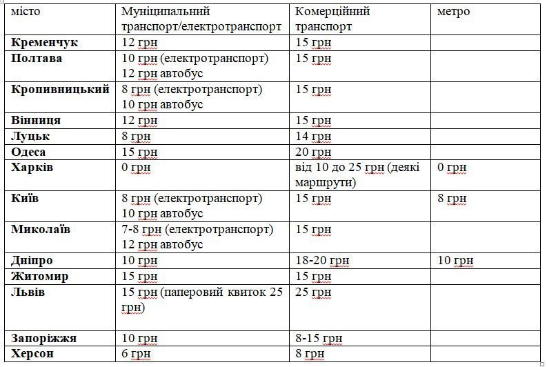 - 8 гривень — в автобусі, трамваї, тролейбусі, фунікулері та метрополітені;
