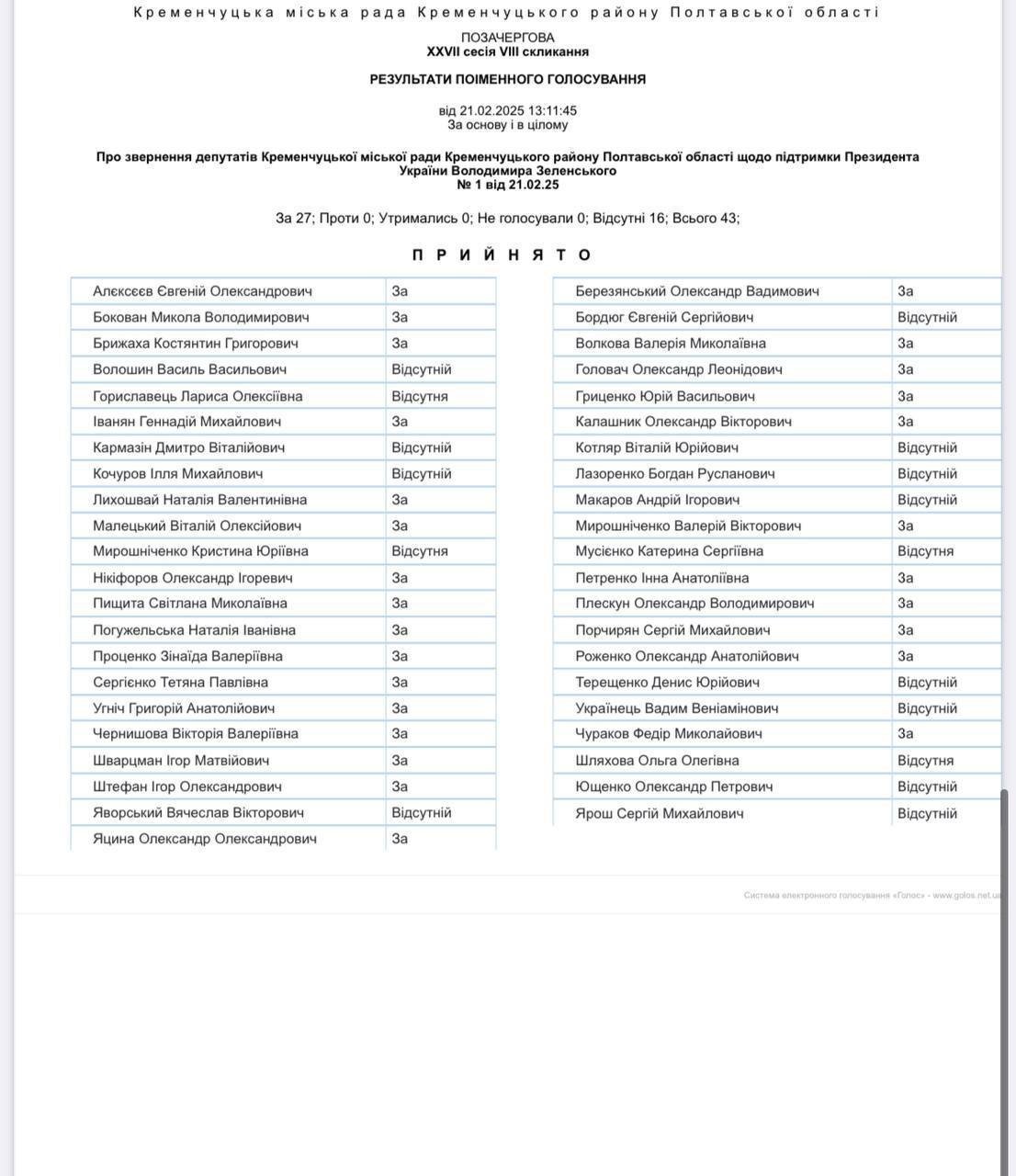 Загалом звернення підтримало 27 депутатів, 16 були відсутні. Найбільше голосів на підтримку президента належить «За майбутнє» — міський осередок даної політичної сили очолює голова Кременчуцької громади Віталій Малецький.