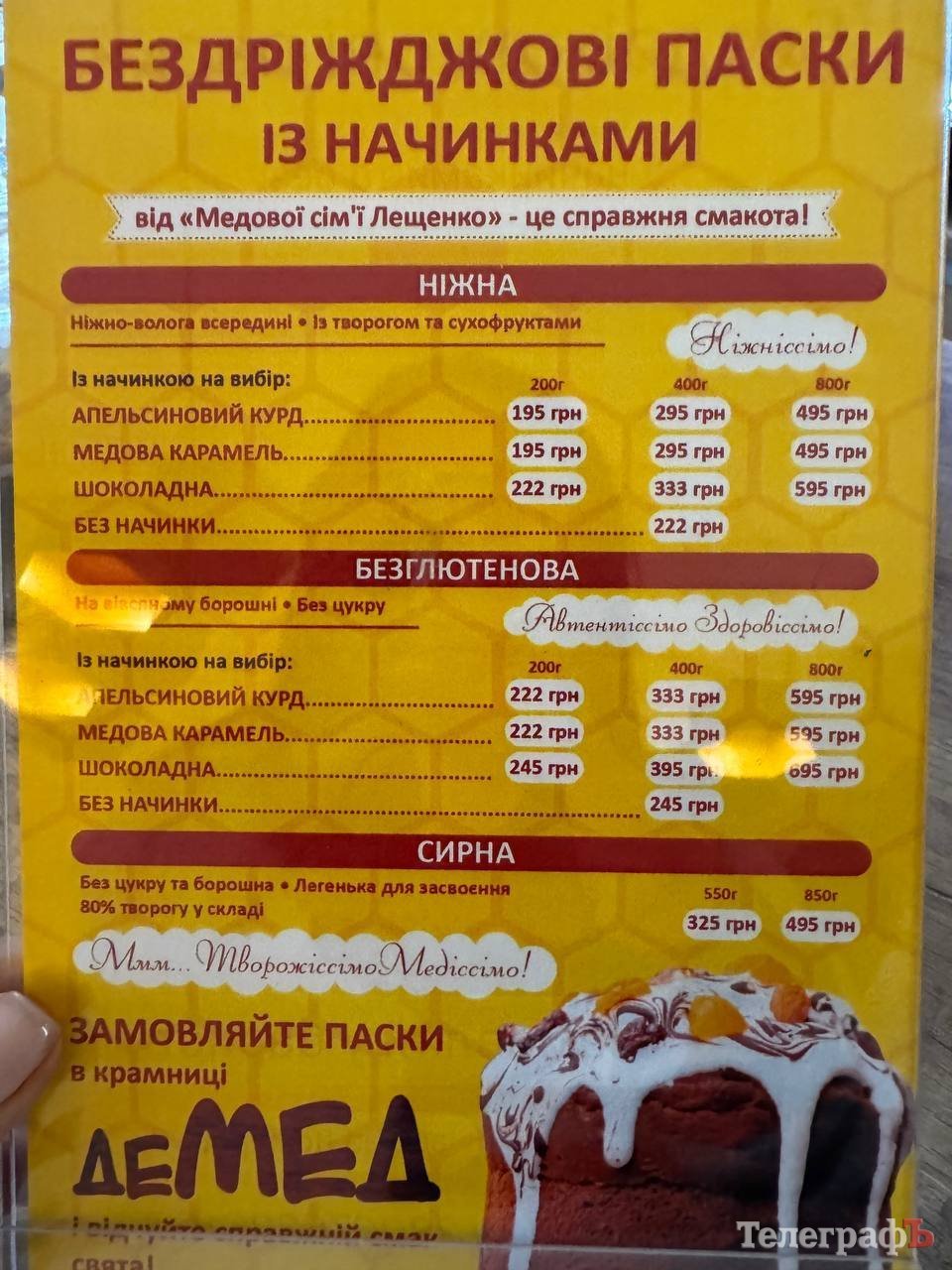 Приймає замовлення на бездріжджові паски з різними начинками й заклад «ДеМед» — крафтове виробництво родини Лещенків. Мінімальна ціна найменшої паски у них — 195 грн. Далі вартість росте залежно від ваги та виду великоднього хліба.