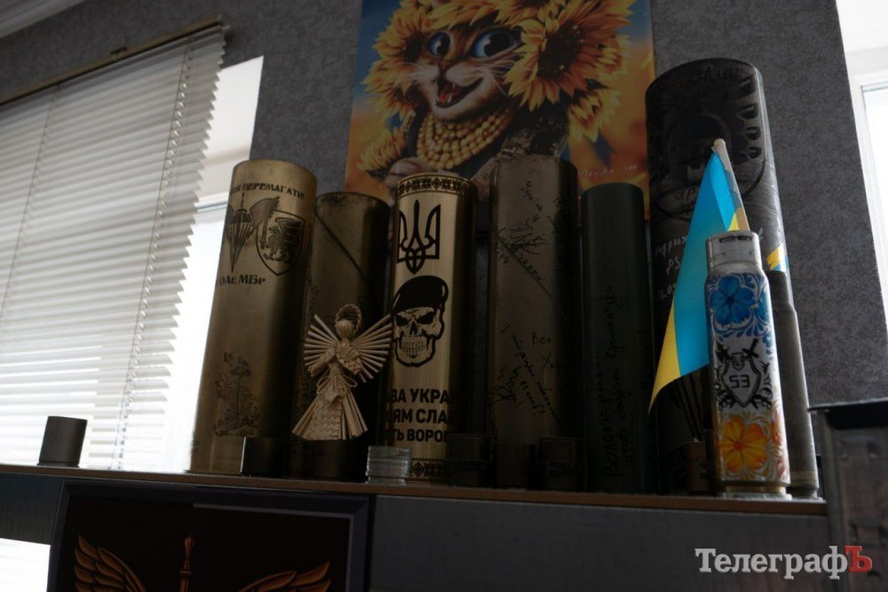 У майстерні Дмитра та Ірини є особливе місце — стіна із підписаними прапорами. Це дяка від військових, які повертаються з фронту і приносять свої бойові прапори з автографами підрозділів. Є також і гільзи з передової.
