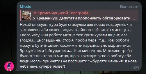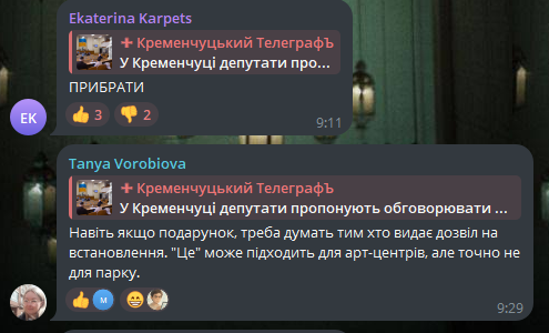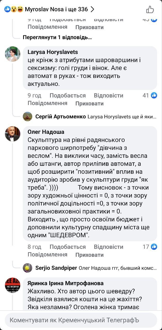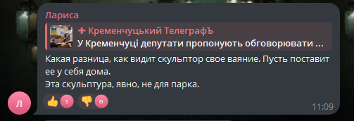 Нагадаємо, що за словами очільниці управління культури і туризму Ірини Вологодської, місто не витратило «жодної копійки» на встановлення скульптури. Однак депутатська комісія з питань освіти, молоді, культури пропонує обговорювати встановлення нових архітектурних об’єктів в місті. Так, зокрема, комісія вважає, що її мають залучати до формування культурного простору Кременчука.