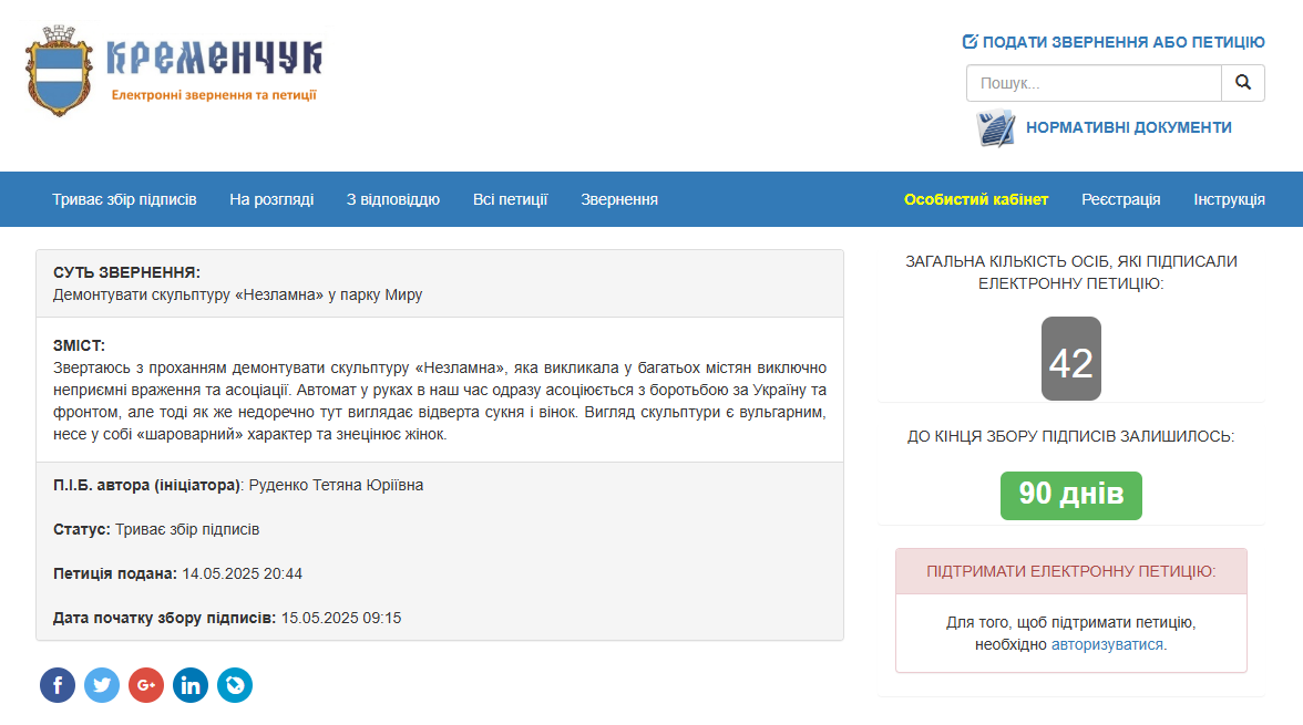 За кілька годин петицію підтримали понад пів сотні кременчужан. Для розгляду міським головою вона має зібрати 250 голосів.