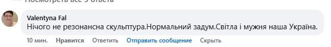 …мистецтво має право на різні форми, а сам скульптор — «бачить світ так, як бачить... От нехай автор у себе дома поставить і бачить так як він бачить. Але своє бачення не виносить на загал. Немає ніякої скульптурної та художньої цінності в його баченні. Ніхто ж не проти увіковічнення нашої боротьби з ворогом, але це творіння…