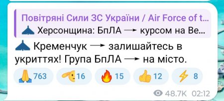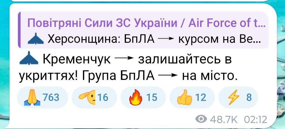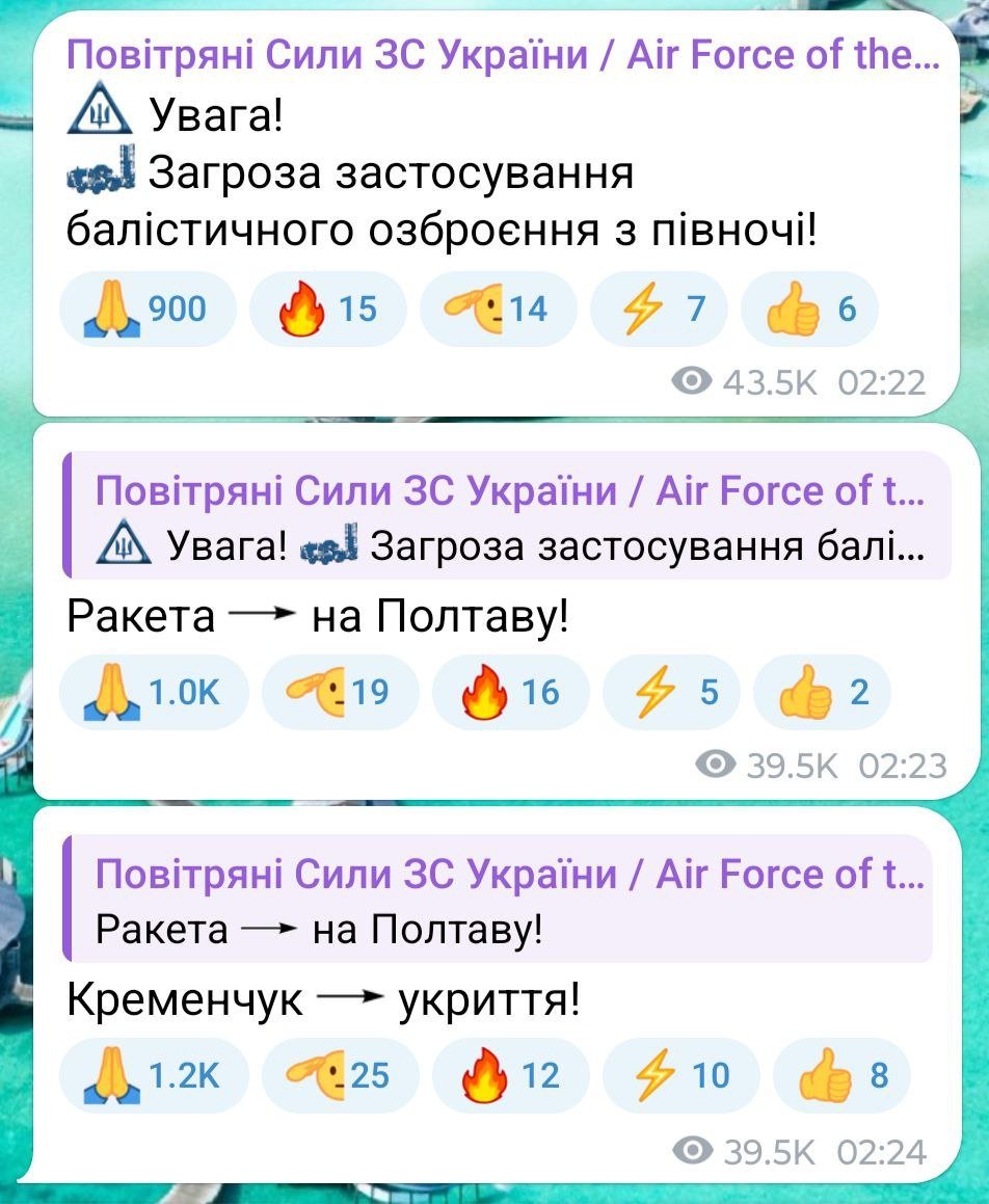 Згодом з’явилася інформація про загрозу застосування балістичного озброєння та ракету на Кременчук.