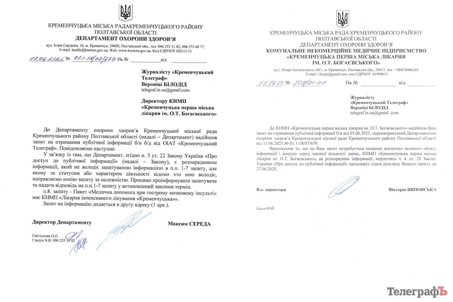 На початку червня «Кременчуцький Телеграф» надіслав запит у департамент охорони здоров’я. Відомство перенаправило запит до лікарні, зазначивши, що «не володіє запитуваною інформацією». Водночас керівник департаменту охорони здоров’я Полтавської обласної військової адміністрації Віктор Лисак у коментарі «Кременчуцькому Телеграфу» порадив звернутись до кременчуцького відомства, адже лікарня — комунальний заклад під порядкуванням міста.