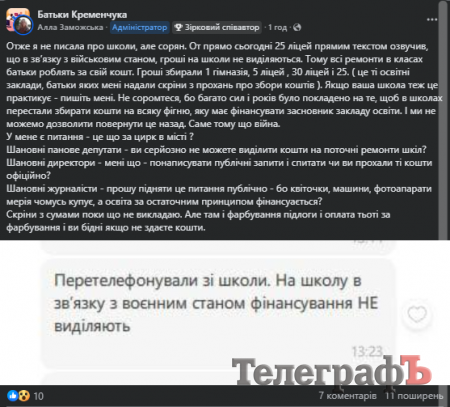 За словами авторки допису, аналогічні збори фіксувалися також у 1 гімназії, 5, 25 і 30 ліцеях. Батьки надсилали скриншоти внутрішніх шкільних чатів, де йшлося про потребу «пофарбувати підлогу», «оплатити роботу» сторонньої особи, а також повідомлення на кшталт «ви бідні, якщо не здаєте».