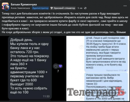 У батьківських спільнотах Кременчука вибухнуло обурення — знову збирають гроші на ремонти шкільних класів. Про це повідомила одна з користувачок Facebook-групи, опублікувавши емоційний допис та заклик до дій.