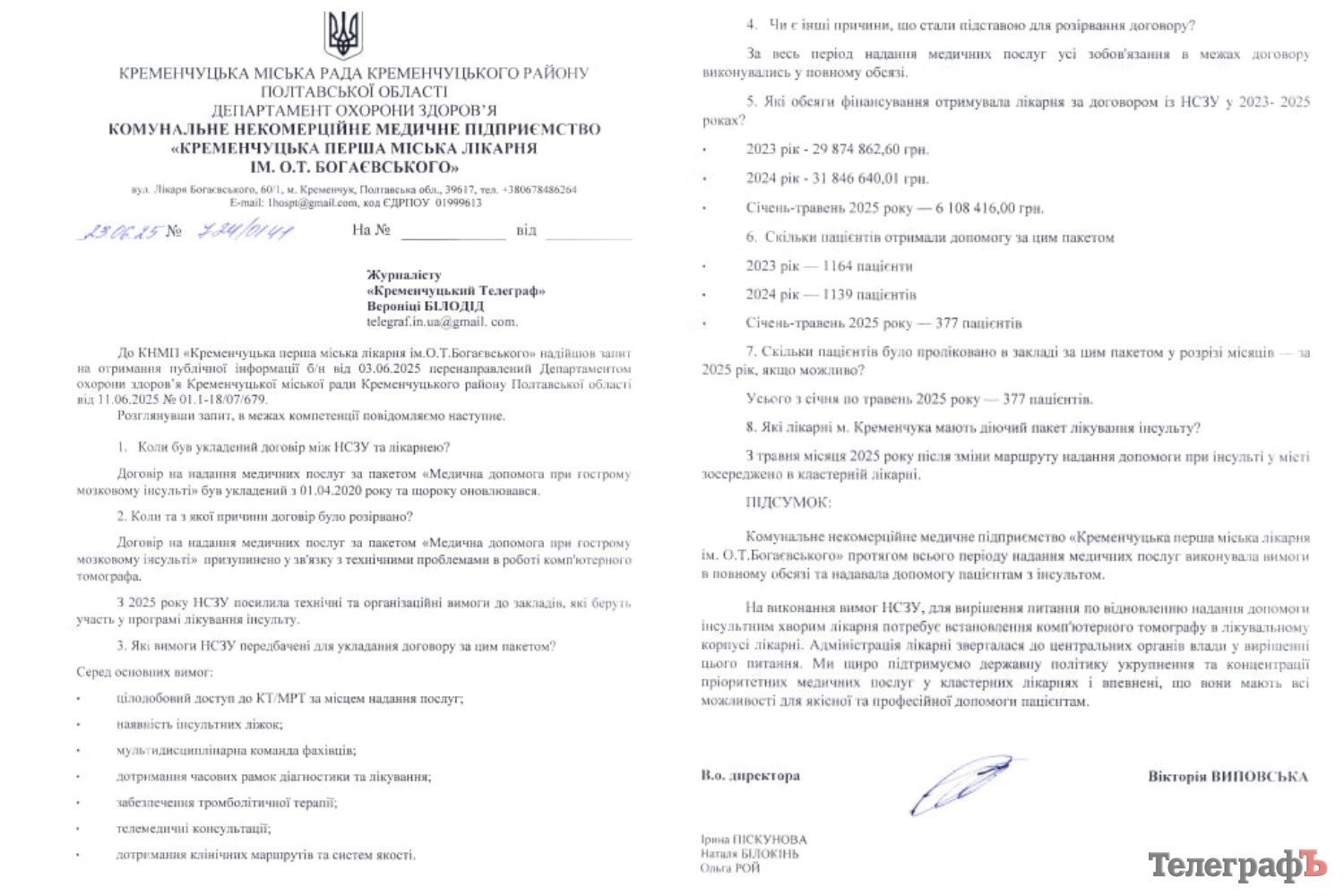 З 2025 року НСЗУ посилила технічні та організаційні вимоги до закладів, які беруть участь у програмі лікування інсульту. Про це йдеться у відповіді лікарні на запит «Кременчуцького Телеграфа».