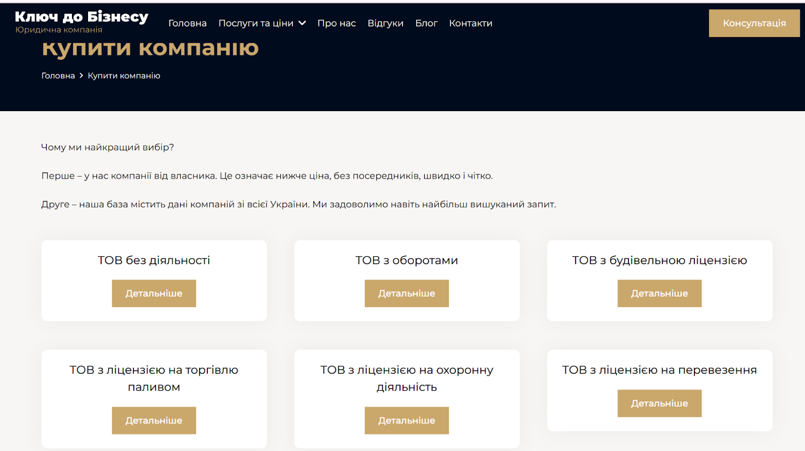 Тут продають сестер та побратимів «Самей актив». Є компанії по 2 тис. грн, а є й за 4 тис. дол — обирай, яку хочеш. Часто у них 500 грн стартового капіталу та сферу діяльності у будівництві/авто/нерухомість (як було у «Самей актив»).