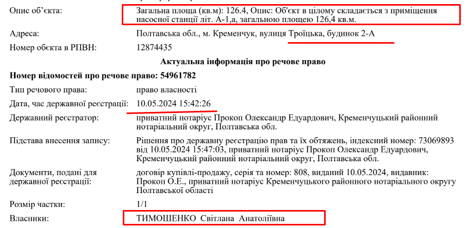 Також у власності пані Тимошенко ще один об’єкт за цією адресою, придбаний у 2024 році — приміщення насосної станції. Практично, це єдиний комплекс з рентгенкабінетом.
