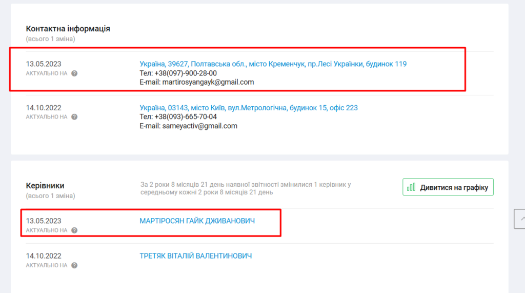 До 2023 року компанія мала київську прописку та належала київському юристу, що спеціалізується на продажі компаній (про нього ми розповімо далі). Але два роки тому змінила адресу на кременчуцьку, власника — на кременчужанина Мартіросяна, а свій статутний капітал з 500 гривень до солідних 10 тис. грн.