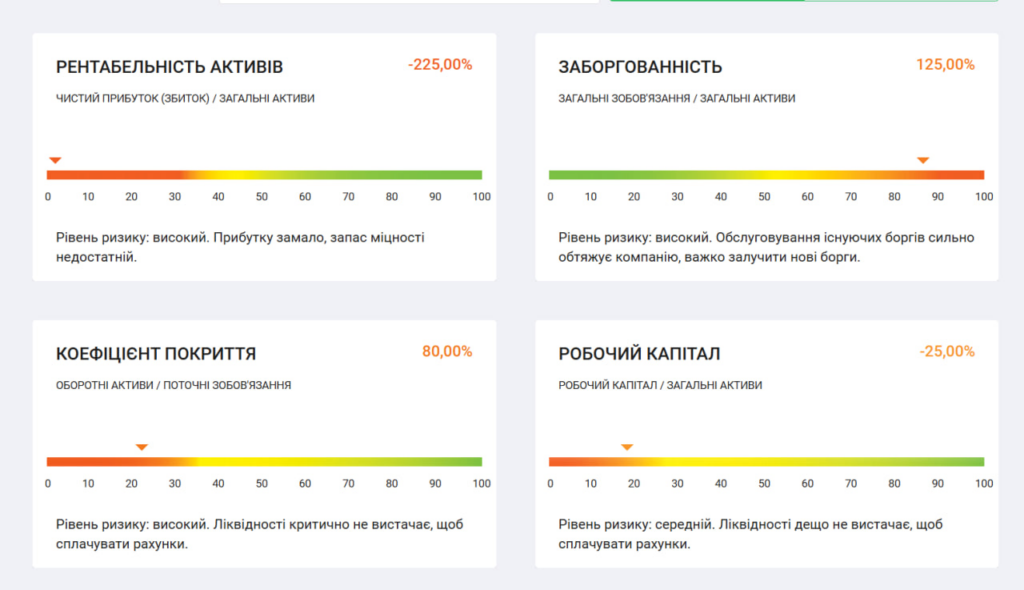- Рентабельність активів: прибутку замало, запас міцності недостатній, ризик високий