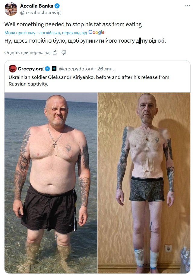 Американська реперка Азілія Бенкс опублікувала глузливий допис із фото українського військового Олександра Кірієнка, який провів у російському полоні майже 3 роки. Приводом для насмішки стало те, що захисник втратив багато ваги. Пост розміщений в акаунті реперки у соцмережі Х.