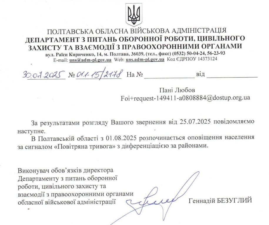 Із 1 серпня на Полтавщині змінюють підхід до оповіщення про повітряну тривогу: тепер про можливу загрозу повідомлятимуть сповіщеннями по районах. Про це пише інтернет-видання «Полтавщина» з посиланням на лист Департаменту з питань цивільного захисту Полтавської облвійськадміністрації.