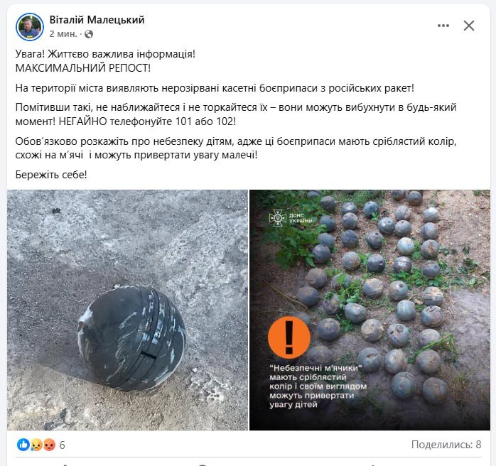 Мер Кременчука Віталій Малецький повідомив про виявлення касетних боєприпасів після російських атак. Вони можуть вибухнути в будь-який момент. Містян закликають одразу телефонувати 101 або 102 та попереджати дітей.