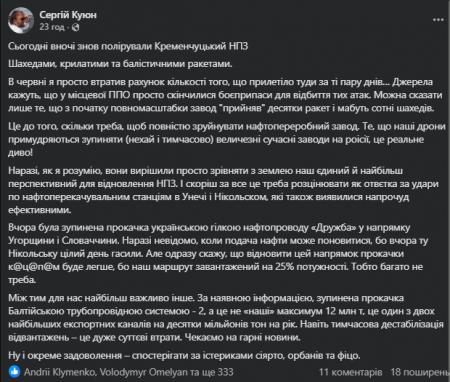 Куюн вважає, що зараз росіяни намагаються повністю зруйнувати єдиний в Україні великий нафтопереробний завод, який ще можна було відновити. Експерт пов’язує ці атаки з українськими ударами по нафтоперекачувальних станціях у російських Унечі та Нікольському.