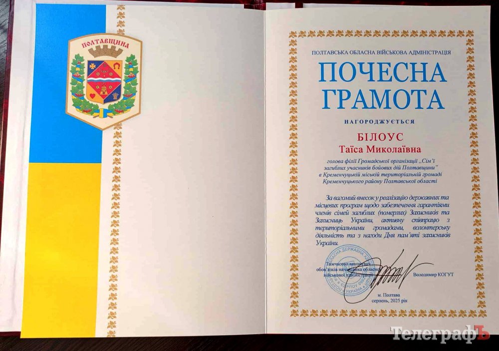 На заході була присутня голова Кременчуцького підрозділу громадської організації «Сім’ї загиблих учасників бойових дій Полтавщини» Таїса Білоус, яку напередодні у Полтаві урочисто нагородили почесною грамотою Полтавської обласної військової адміністрації.