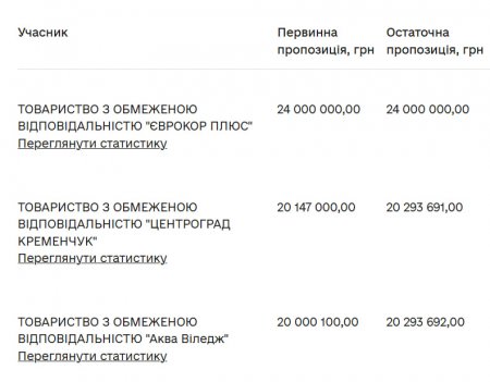 Свої цінові пропозиції зареєстрували 3 компанії — ТОВ «Єврокор Плюс», ТОВ «Центроград Кременчук» та ТОВ «Аква Віледж». Найбільшу ціну за лот запропонувала компанія «Єврокор Плюс»:
