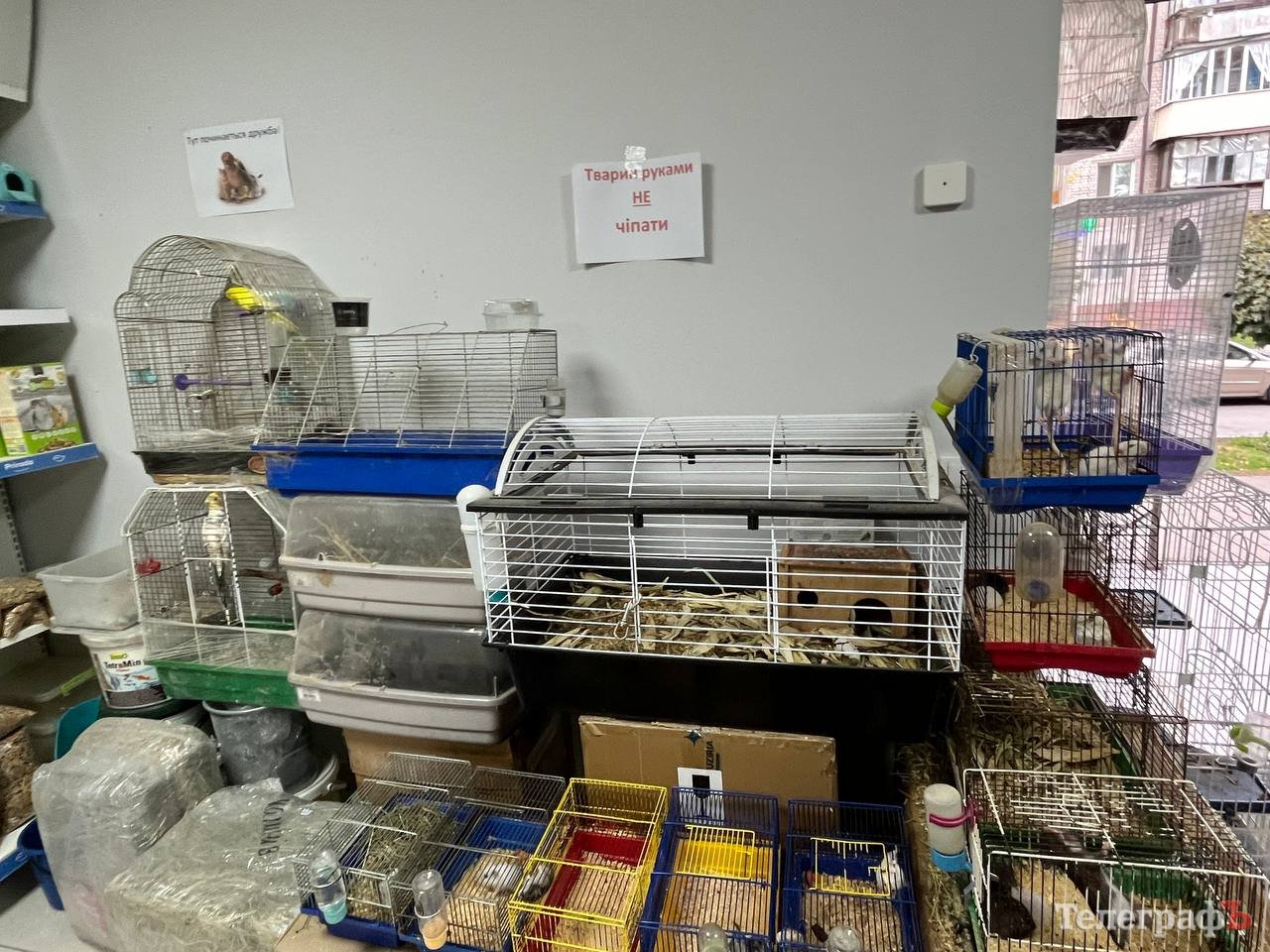 До того ж, на стіні поруч із клітками висить листівка, на якій червоними літерами написано «Тварин руками не чіпати».