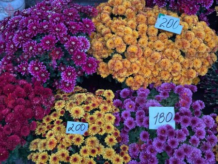 До середини жовтня на ринку — багато хризантем. Горщик із квітами коштує від 180 до 200 грн залежно від розміру. Продають рослини різних кольорів — жовті, бордові, рожеві, фіолетові.