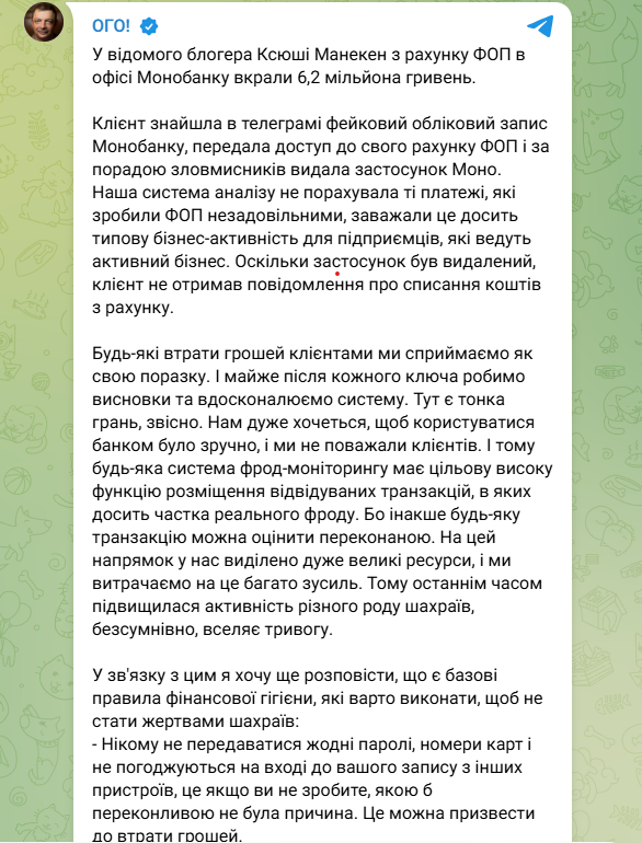 Пізніше співвласник Monobank відреагував на ситуацію в своєму телеграм-каналі.