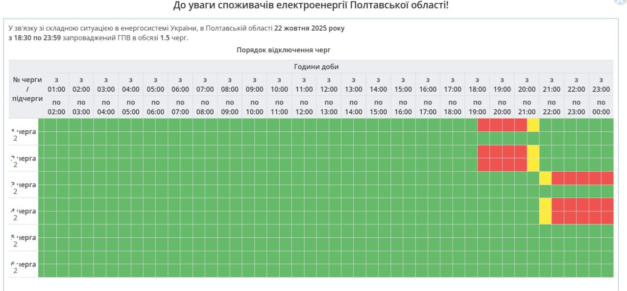 Нагадаємо, 22 жовтня на Полтавщині діють аварійні відключення