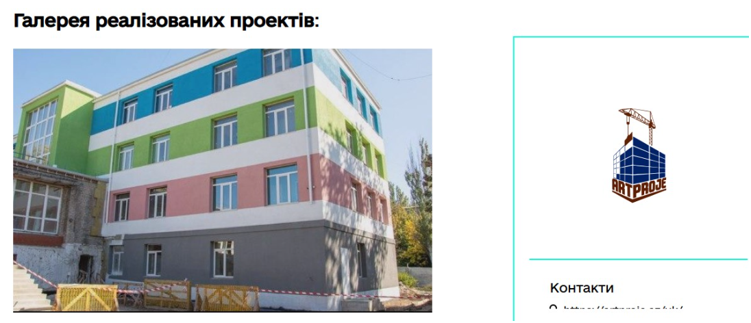 Частина зображень, за пошуковими даними, відповідає будівлям в Україні, що були реконструйовані (до повномасштабної війни) у рамках проєктів з енергоефективності — у містах Луцьк, Мелітополь, Вінниця, Маріуполь до окупації. Публікація на офіційному сайті Маріупольської міської ради датована 8 жовтня 2020 року, у ній йдеться про капітальне будівництво школи № 26 у Приморському районі міста. Саме тут ми й знайшли світлину, використану в галереї ММС «АРТ ПРОЖЕ».